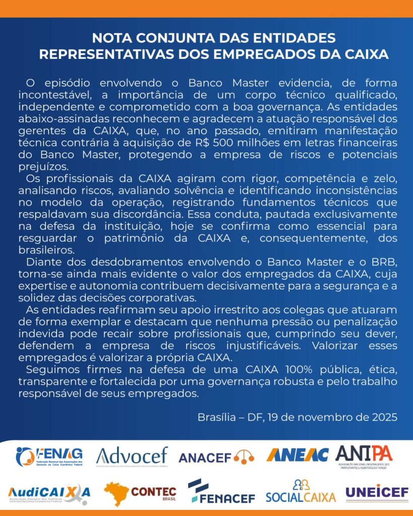 Nota conjunta das entidades representativas dos empregados da CAIXA
